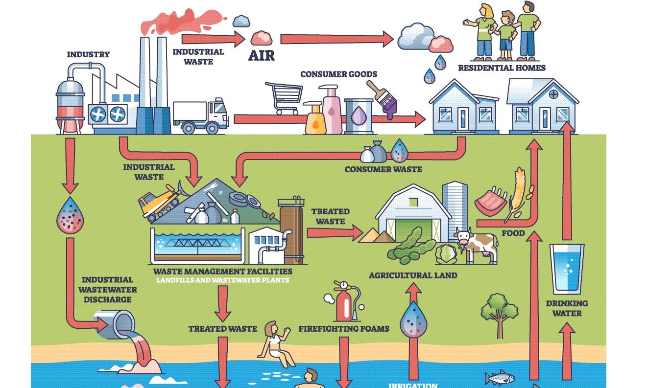 PFAS treten aus der Industrie, der Landwirtschaft und aus Konsumprodukten in die Umwelt über. Wasser und Luft verteilen die Chemikalien global. Böden, Sedimente und Gewässer speichern sie und geben sie laufend wieder ab. Es entsteht ein geschlossener Kreislauf aus Eintrag, Speicherung, Mobilisierung und Wiederverteilung.