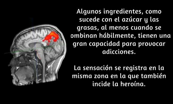 Infine è stato dimostrato che alcuni ingredienti, come lo zucchero e i grassi, almeno se sapientemente combinati, hanno una grande capacità di provocare dipendenze. La sensazione è registrata nella stessa area in cui colpisce anche l' eroina . Ad esempio, vengono citati i biscotti al cioccolato Tim Tam (link in inglese), (p. 156).