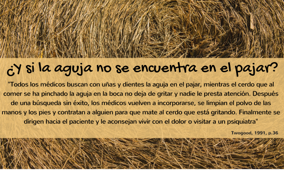 Se la chiropratica fallisce come trattamento tradizionale e si perdono anche ortopedici e neurologi, ulteriori test tendono a continuare. Queste analisi sono progettate per trovare un ago in un pagliaio, ma: "Cosa succede se l'ago non si trova nel pagliaio?" (p. 36). L'ago è nella mangiatoia dove mangiano gli animali, tuttavia, indipendentemente da quanti test e analisi vengono eseguiti, i risultati non indicano l'origine della malattia e il processo prende la direzione sbagliata.