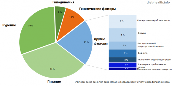 Частое употребление мяса (особенно красного мяса), небольшого количества фруктов и овощей в меню, курение и употребление табака, малоподвижный образ жизни, алкоголь, пищевые добавки и ожирение напрямую связаны с более чем половиной всех случаев смерти от рака.